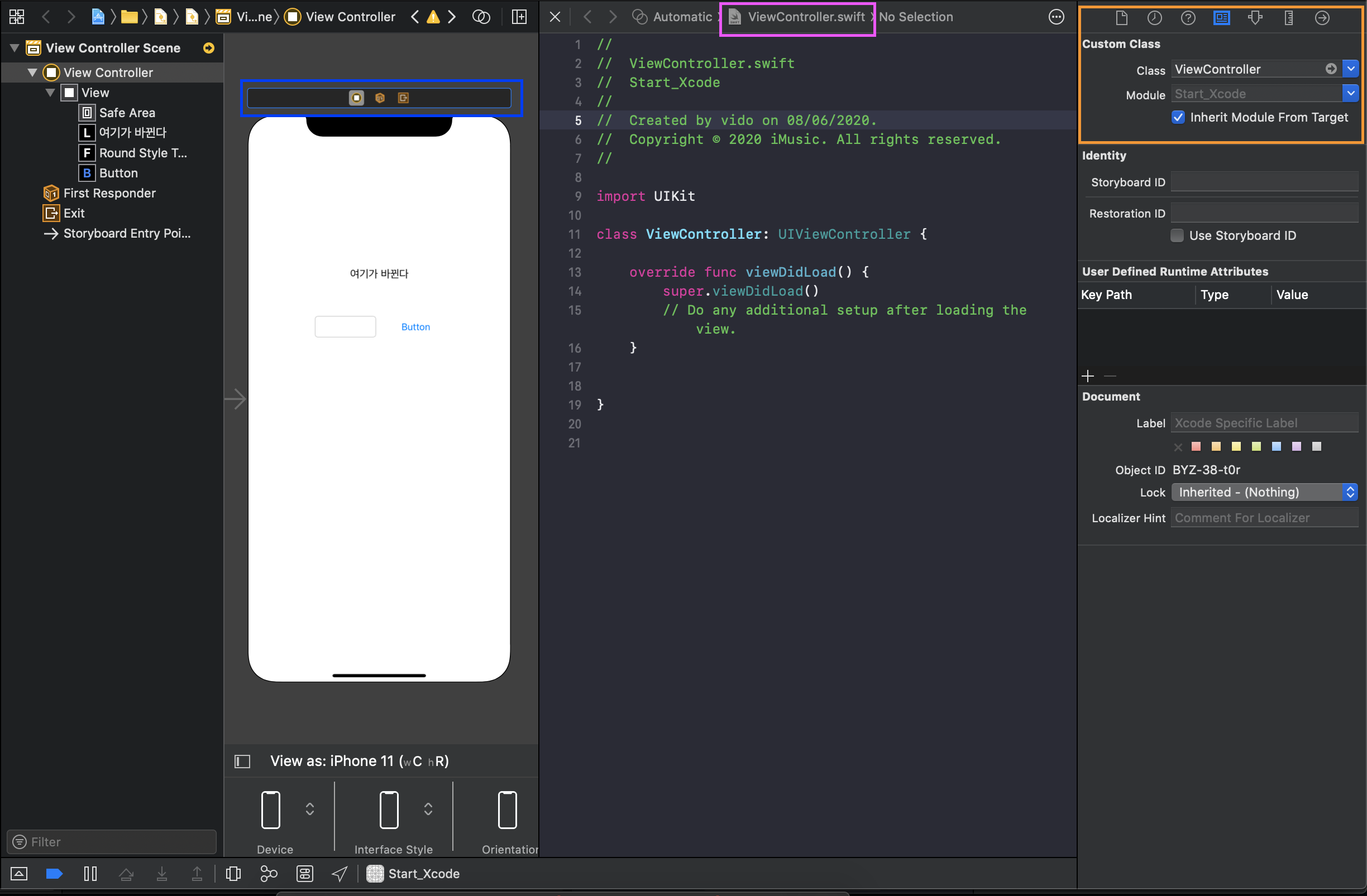 2. 주황색 네모칸의 Custom Class 부분의 Class가 작업할 ViewController로 되어있는지 확인합니다.