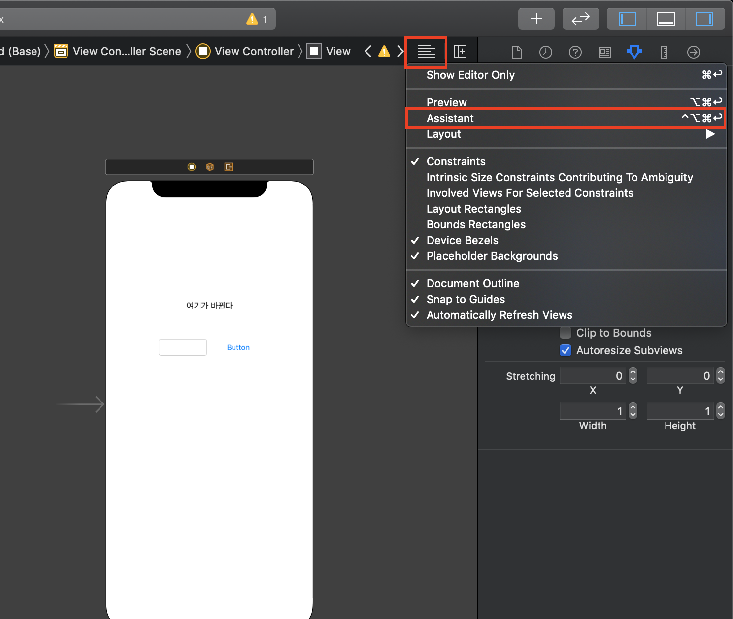 xcode 상단에 빨간색 네모칸의 버튼을 클릭해 [Assistant]를 클릭해 주세요.