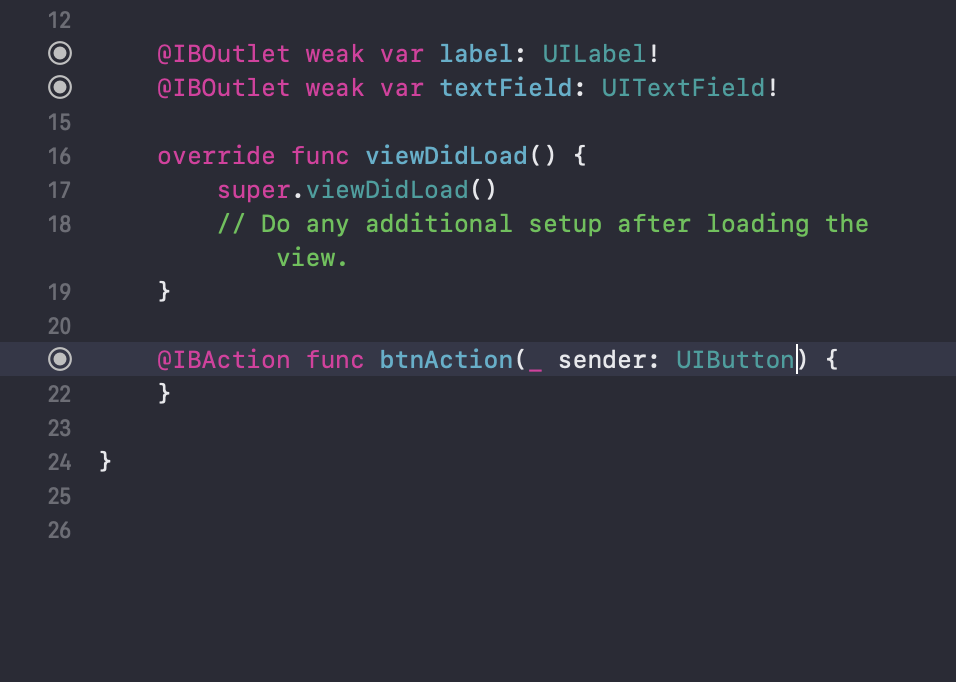 UILabel을 연결할 때처럼 쭈욱 끌어서 controller에 드래그하면 Connection에 Action이라는 항목이 있습니다.