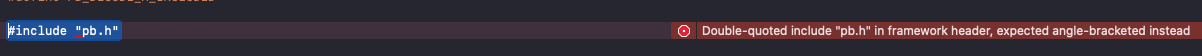 Double-quoted include "pb.h" in framework header, expected angle-bracketed instead