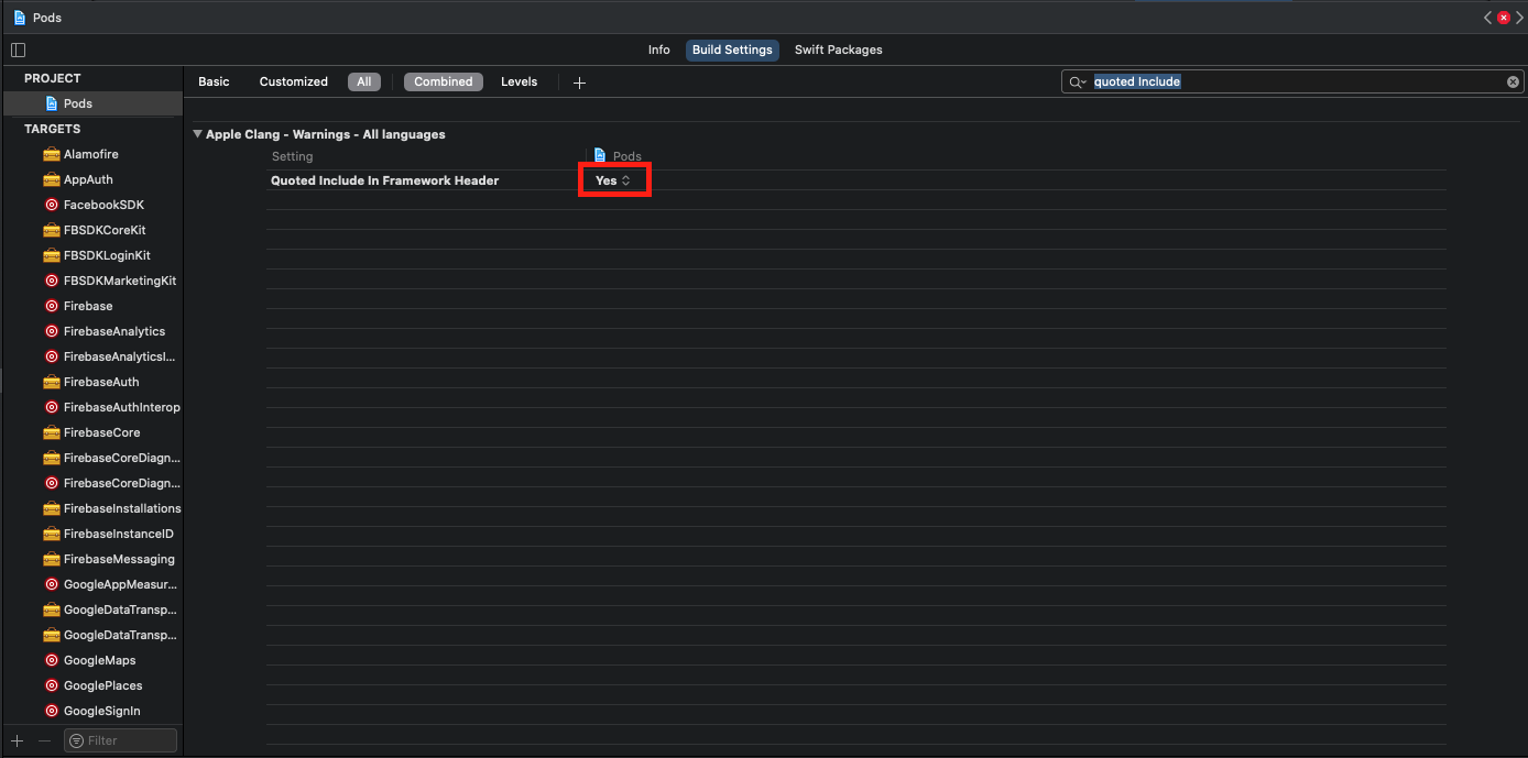 2. Build Settings에서 "quoted Include"를 검색하신 후 아래 네모칸의 상태 값을 No로 바꿔주세요.