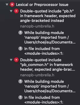 Double-quoted include "pb_decode.h" in framework header, expected angle-bracketed instead